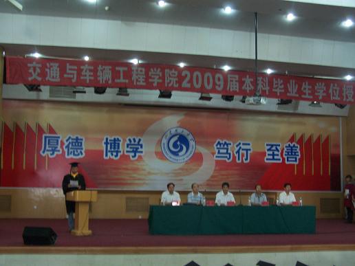 在庄严隆重的国歌声中,学位授予仪式正式开始。仪式进行第一项,由副院长程诚宣读了《交通与车辆工程学院2009届本科毕业生学士学位授予情况》的说明,参与此次授予仪式的毕业生分别来自车辆工程、交通运输、交通工程和热能与动力工程专业共482名。仪式第二项学生代表宋长明代表全体毕业生发言,他向学院各位老师表示真诚的感谢,向昔日相亲相爱的各位同窗道一声珍重。大学四年是每个过来人的一笔财富,他希望各位同学能在以后的路上越走越远。仪式进行第三项,院长任传波讲话,他首先代表学院近2000名师生向2009届毕业生表示祝贺,接着他叮嘱同学们要勇敢踏上社会,勇敢承担国家赋予的任务,戒骄戒躁,取长补短;要先做人后做事,将理工学子的优秀风尚传承下去。最后他祝愿同学们的前程更加光明。仪式第四项,学院领导为各位毕业生正冠拨苏,授予学士学位证书,各位毕业生纷纷和学院领导握手合影。最后学位授予仪式在校歌中结束。