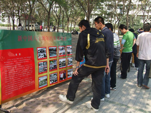 活动开始后就吸引了大量的同学前来参观,图片记录了新中国汽车六十年的发展历程,铭刻了中国汽车工业伴随着新中国的成长,走过的风风雨雨,从无到有,从小到大,逐步走向辉煌的历史。在活动过程中,交通汽车俱乐部的负责人耐心、热情的为同学们讲解有关有关图片的历史。一幅幅真实的历史图片,仿佛把同学们带回到了历史的瞬间,同学们对新中国的辉煌成就也深感自豪。活动大约持续了一个小时,在同学们对祖国的深深祝福下结束。