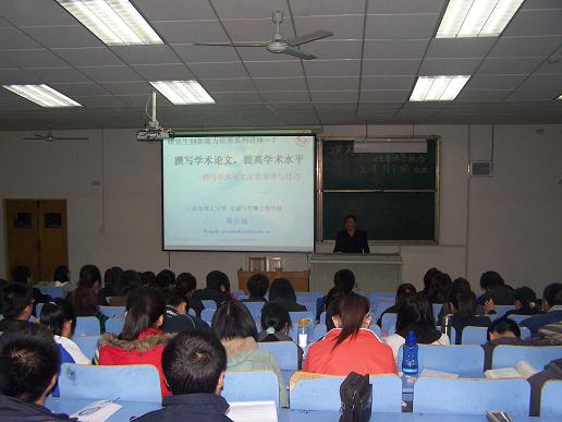 为加强研究生培养力度,进一步完善学校研究生教育工作,促进研究生学术论文写作能力的提高,培养研究生创新研究能力,研究生创新能力培养系列讲座之《撰写学术论文提高学术水平》学术报告讲座于4月29日晚7:00在五号教学楼101教室举办,主讲人是交通与车辆工程学院车辆工程系教授周长城。前来聆听的有我校研究生及正在备考研究生的大三学生等百余人,在周教授带动下讲座场面气氛活跃异常,在座学生无不受益匪浅。