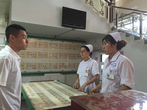 随后,成员们来到张店区中医院进行调研。为了更加真实的了解残障人士的生活环境以及设施情况,实践团成员分为两个小组。一组成员向护士等医院的工作人员了解该院残障人士的生活状况及他们在这所能受到的特殊照顾。据了解,医院的各个楼层都设有志愿者服务台,能随时的向残障人士提供帮助和照顾,并且可以及时应对突发情况。第二组成员对医院的各个楼层进行了考察,了解到医院每个楼层都设置了无障碍电梯、无障碍厕所等设施,解决了残障人士日常生活中行动不便的问题。而且一楼特别设置了轮椅借用处,并有专门的人员给予残障人士及时有效的帮助。