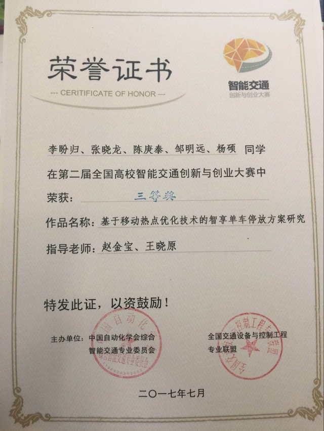 2017年7月22日,第二届全国高校智能交通创新与创业大赛在山东交通学院举行。我校交通学院赵金宝、王晓原老师指导,李盼归、张晓龙、陈庚泰、杨硕、邹明远同学完成的《基于移动热点优化技术的智享单车停放方案研究》作品,荣获大赛三等奖。本次大赛以“大数据+智慧交通”为主题,鼓励高校在“智能交通”、“交通安全”等领域中选择和组织参赛作品,从多元化角度展示学生对于现代交通问题的关注和解决方案。大赛共收到百余件作品,其中,浙江大学、北京工业大学、西南交通大学、山东理工大学等全国40余所高校的56支队伍入围决赛。