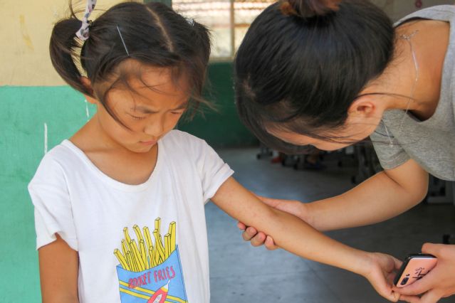 队员们大多是第一次开展教学工作,尽管经过了一晚的备课,在讲台上仍难免有些紧张。但孩子们的朴实与热情很快感染了队员们,短暂的拘谨过后,教学工作渐渐步入正轨。教学过程中,一名同学突发不适,发生了过敏现象,任课队员马上将她带到办公室,询问病情并通知了其家长。