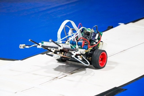 后转移场地,室外越野组的队伍上场,该组别的参赛所选用的车模体积较大,但是在赛道上仍可以灵活转弯,越过障碍,最后也顺利完成了比赛。最后一个组别是横冲直撞信标组,也是最具观赏性的一个组别,要求选手以尽可能短的时间撞击八个随机亮起的信标,难度系数较大,但选手依旧出色的完成任务。
