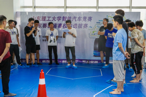 本次比赛分四个组别,共有十一组队伍参加比赛。活动开始前,为了适应比赛场地,选手们不断地调试自己的智能车。比赛开始前,智能车协会会长周鹏超向大家介绍本次比赛的规则和注意事项。随后,参赛队员开始抽签,按照抽签顺序进行比赛。变形金刚三轮组首先上场。看裁判一声令下,赛道上的智能车便跑了起来,在赛道上极速前进。经过断路时还要切换行走姿态。之后是小白四轮组,尽管在比赛开始时出现失误,但是选手迅速调整,最终顺利完成比赛。