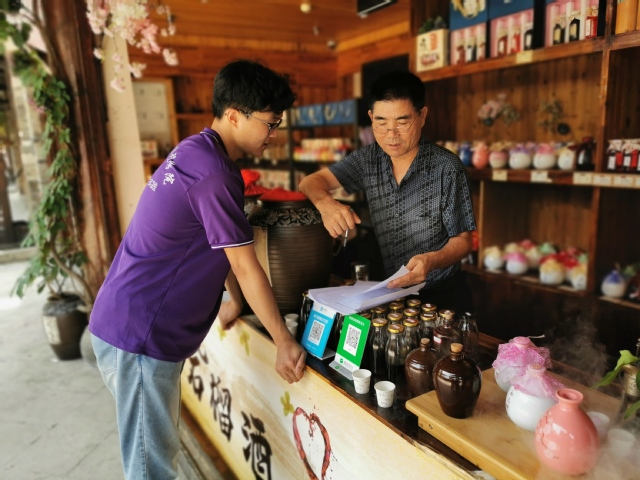 让大叔写调查问卷的时候,大叔很爽快的答应了,不大懂的地方还跟我们交流。写完问卷之后,大叔还很关心的问我们来自哪个大学,在台儿庄住的怎么样。最后我们走的时候还请我们每个人尝了三生三世桃花酿,那种甜甜的味道甜到了我们每个人的心里。