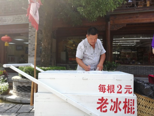 在台儿庄古城,这是第二次见到大叔了,第一次见大叔时,我们拿出镜头拍大叔,大叔不好意思的笑了,这次拜托大叔填问卷,他特别爽快地答应了。大叔眼神不好,扯着身子填。中途有来买冰棍的游客,大叔看了一眼又继续填问卷。我们几个难为情的让大叔先照顾生意,大叔麻利的从箱子里抓出五根冰棍交给游客,在我们还没反应过来的时候,大叔已经开始继续填写,虽然填的很慢,但是看的认真仔细,一丝不苟。