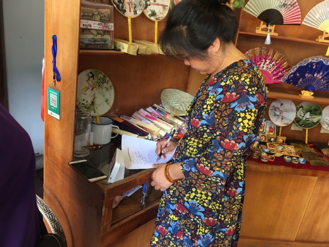 快要出古城的时候,我们又采访到了一家工艺品店的老板娘,一听说要帮忙做调查问卷她很开心,热情的张罗着让我坐在她的旁边。她有老花眼,我们便每个题挨个儿读给她听,同时向她解释以便于她更充分的理解。在填写完问卷后她还对我们说了许多她自己对于古城建设和旅游交通的建议。