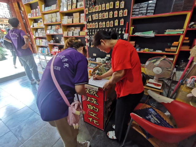 古董店隐秘地躲藏在古城的精品小店中,对于这神秘而古老的物件,我们一直想要窥探它的全貌。但是当看到古董店的阿姨坐在店门口悠闲的摇着圆扇,我们一度不忍心打扰这恬静的画面。当阿姨察觉出有人在向这边探头时,阿姨十分热情地过来询问是否需要帮忙,在得知我们是大学生来这边社会实践后,阿姨迫不及待地向我们讲解台儿庄古城最值得观赏的几个景点,并推荐了地方美食。答卷过程中,她认真思考每一个问题,还针对交通方面问题提出建议。