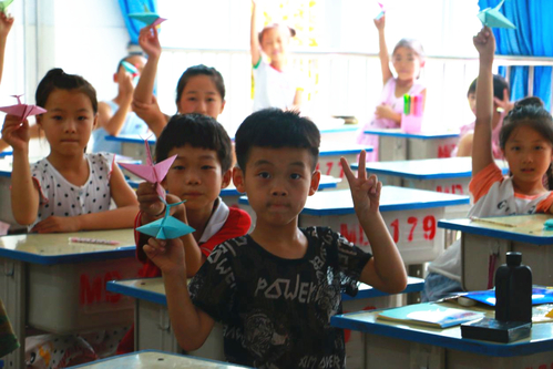 学生们尽情发挥自己的想象力,拿起彩笔在自己的作品上进行创作。折完飞机的各个组成部件后就要进行组装,由于组装过程较为繁琐,一些小朋友在进行到这一部分时遇到了困难,但是大家都没有放弃,举手寻求老师的帮助。支教老师耐心为其解答并帮助学生完成组装部分。最后,每个同学都完成了自己的作品,大家举起自己的飞机向老师展示,脸上充满了喜悦与成就感。