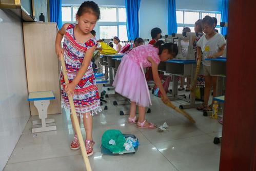 接着实践团的女队员带领着一年级的学生在一起打扫教学楼教室,在共同劳动中体验生活不易,更好地发扬中华民族的传统美德,在劳动体验课结束后,队员给孩子们布置了一个作业:回家给爸爸妈妈洗一次衣服、洗一次脚、做一次饭。希望通过这次作业,可以帮助孩子们更加深刻地体会父母不易。