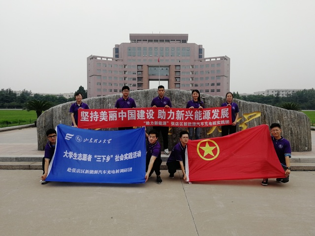 7月15日上午,“助力新能源”张店区新能源汽车充电桩实践团于山东理工大学弘远楼前举行了出征仪式,正式开始了本次调研活动。作为交通学院团总支的一部分,该团队本次调研同时也代表了交通学院党总支,旨在为社会尽自己的一份力。