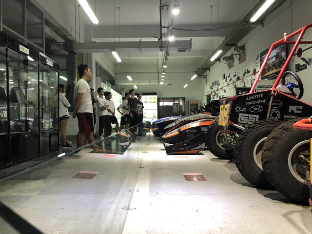 实践团队在队长的带领下,到达HRT车队所在的创新实验楼,实践团成员参观了HRT车队过往赛季的赛车,对其赛车结构及用材进行深入分析,其悬架部分采用的是国内最先进的材料,车身材料精细,运营组成员于炳浩虚心像大三学姐请教运营技巧,双方讨论今年的成本设计报告以及营销报告。经过比较两校车队的差距,我校车队仍有很多地方需要改进,悬架组、传动组、转向组、车身车架组组长之间互相交流,将对今年的赛车进行一定的改进。