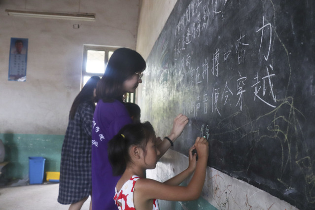 学生们讲完自己的理想后,紧接着,“圆梦”实践团成员与学生一起用五颜六色的粉笔在黑板上描绘出自己坚定的理想信念,与此同时,团队成员本着严谨、认真、负责的态度,小心翼翼的保护着学生们,其他队员细心与学生交流,帮助学生更清楚表达自己的内心,展现自己的风采。五颜六色的字体象征着学生们精彩斑斓的理想,灵动的字符展示了学生们积极乐观的态度。最后。团队成员在黑板上写下关于理想的句子,提醒学生们要坚持自己的理想。