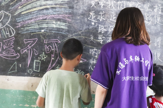 学生们讲完自己的理想后,紧接着,实践团成员与学生一起用五颜六色的粉笔在黑板上描绘出自己坚定的理想信念,与此同时,团队成员本着严谨、认真、负责的态度,小心翼翼的保护着学生们,其他队员细心与学生交流,帮助学生更清楚表达自己的内心,展现自己的风采。五颜六色的字体象征着学生们精彩斑斓的理想,灵动的字符展示了学生们积极乐观的态度。最后。团队成员在黑板上写下关于理想的句子,提醒学生们要坚持自己的理想,
