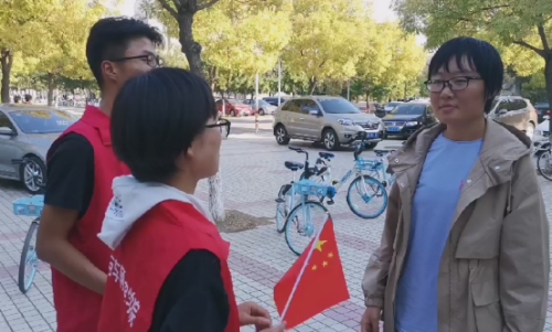 同时,为了更好的宣传爱国教育,培养同学们的爱国精神,生活服务中心的各位成员手持小国旗为十二教的同学进行提问和采访。