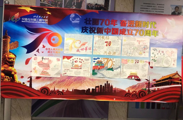本次比赛的参与对象为交通与车辆工程学院2019级全体学生,共收到参赛作品13件。各班学生以庆祝新中国成立70周年为主题 ,或一人独自完成,或几人合作进行,设计版面,查阅资料,用艳丽色彩描绘多彩世界,用通俗文字抒发感恩之情,用赤子之心绘制出一幅幅图文并茂,通俗易懂的作品。各班先进行筛选,经评委筛选,最终有8幅作品获优,获奖作品均在南大厅展板展示。