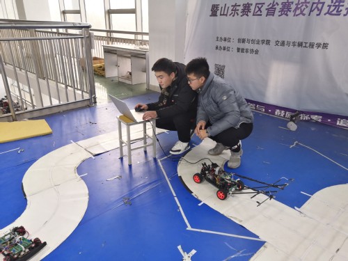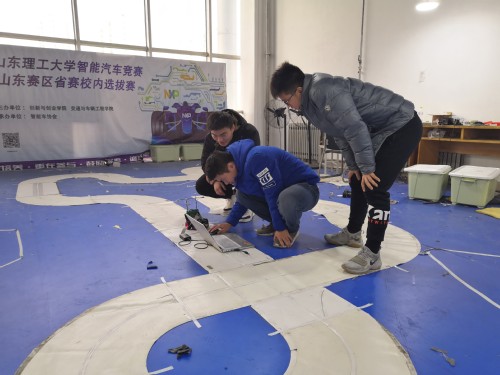 经过几轮测试,二轮组赛车在经过弯道处时出现了bug,冲出赛道,前几次调试无果,三人继续埋头进行调试。调试过程总是枯燥、让人焦急紧张而又充满期待,经过一个多小时的不懈调试,最终,bug解除,赛车顺利跑完全程,用时较之前也有所缩短。相比之下,越野组赛车情况更好一些,调试工作较为顺利。
