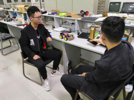 答辩小组进入543室后,首先就自己的智能小车的设计思路、各项功能模块的与程序编写进行介绍,接着智能车协会会长金长城与副会长郭浩对答辩者进行问题提问并给予提升意见。