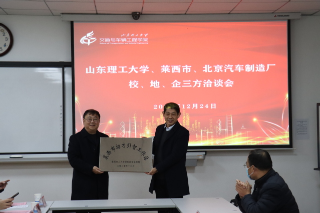 于伟积极评价了山东理工大学推进校、地、企融合发展的创新做法,他表示,莱西市及相关企业与山东理工大学的合作有着巨大的潜力、广阔的空间和美好的前景,希望今后加大合作力度,实现互惠共赢。莱西市人力资源和社会保障局副局长孙明辉介绍了莱西市招才引智政策,表示通过本次到访将进一步加强联系互动,不断推进各方面合作。随后,孙明辉、李涛为“莱西市招才引智工作站”授牌。