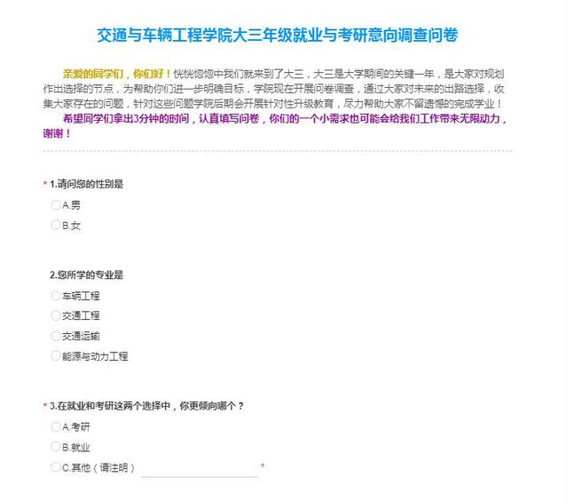 大学三年级是大学生活的关键时期,不仅是学习专业知识及提高各方面能力的重要阶段,还面临着考研或找工作的抉择。为提供针对性的指导,做好大二升大三教育,结合大三年级学生的成长特点和教育规律,开学初学院设计了《交通与车辆工程学院大三年级就业与考研意向调查问卷》,并在所有大三学生中开展了问卷调查。