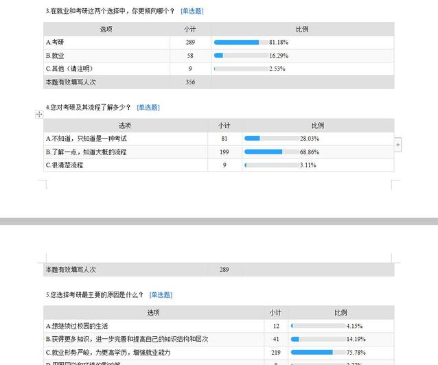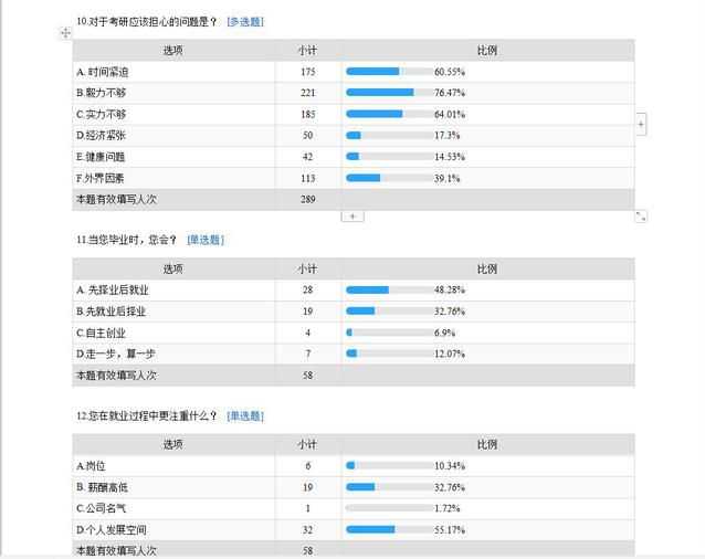 对于选择考研或就业,有针对想设置了不同的题目,从对选择方向的动机、了解程度、准备情况、需要解决的问题、关注的问题等方面设置了16个题目,进行了调查。