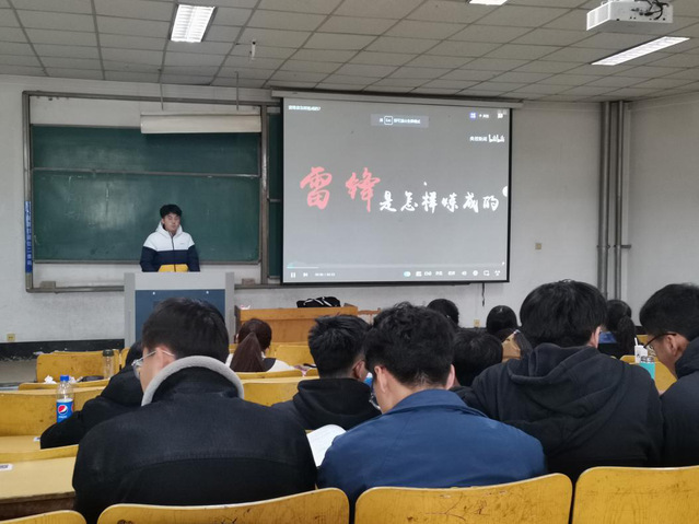 随后,班长耿文鹏播放了央视的纪录短片《雷锋是怎样炼成的》。短片围绕雷锋日记讲述了雷锋为人民服务的起因以及其感人事迹,“人的生命是有限的,可是为人民服务是无限的。”视频中雷锋质朴的话语生动地诠释了公而忘私的雷锋精神,展现了雷锋同志乐于助人,爱国爱党,无私奉献,一心为民的优秀品质。观影期间,同学们被雷锋乐于助人的精神感动,又因雷锋吃过的苦,受过的累而流泪。视频结束后,班长与同学们交流观后感,让同学讲述了自己的亲身经历。最后,团支书张璨提出对支部成员们的希望:学习雷锋,从小事做起,从身边做起,学习雷锋的活动结束了,但是学习到的雷锋精神不能丢,要长久坚持下去。此次团日活动圆满结束。