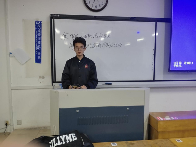 3月11日晚,我院车辆2003班于12号教学楼210教室举办寒假归来话实践主题分享会。此次会议由车辆2003班团支部书记石梁毅主持,车辆工程专业2020级辅导员吕科晨和车辆2003班全体同学共同参加。