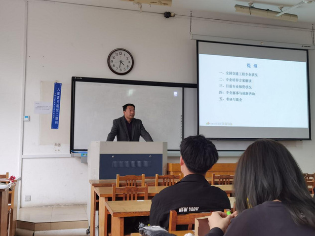在交通工程专业专场,张洪宾首先向同学们介绍了全国交通工程专业现状,并给同学进行了专业培养方案及课程体系的解读。随后,张洪宾为同学们列举了一些专业的全国和省级专业赛事,强调了专业赛事的重要性,并鼓励同学们踊跃参加。最后,张洪宾给同学们就考研与就业的相关问题为同学们作了详细解答。
