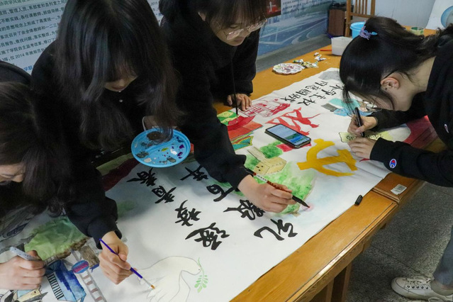 中。同时,现场参观的同学们也纷纷地参与到创作的过程中,一同于书画中感受党的百