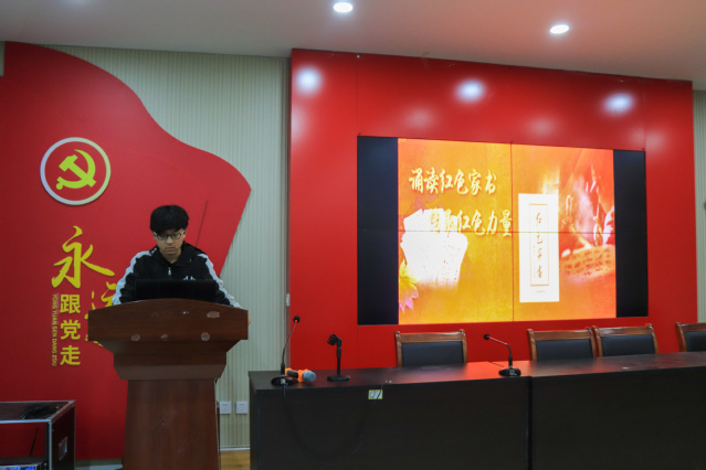此次活动主题为“诵读红色家书,传承红色力量”。翟鲲鹏首先向大家详细地介绍了赵一曼、左权、夏明翰等革命先烈的英雄事迹,学习他们投笔从戎、甘洒热血的爱国精神。接着,他又饱含深情地为大家诵读了《赵一曼写给宁儿的一封信》,并抒发了自己的感受。他说,烽火连三月,家书抵万金。赵一曼先烈虽然离我们远去,但她的精神将永垂不朽,她的理想信念将永远地烙印在我们每个人的心中。作为新时代的青年,我们应当不忘初心、铭记历史、牢记使命、担当作为。
