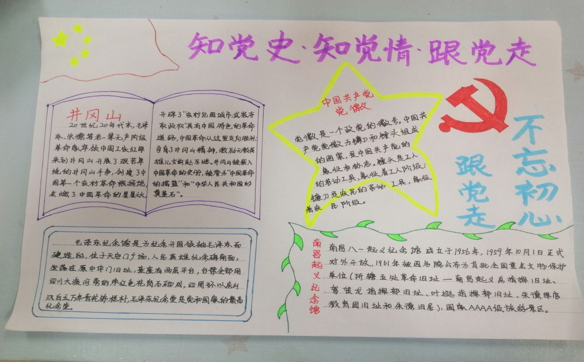 随后,大家学习了井冈山革命精神和南昌起义伟大事迹。通过中国共产党人的历史使命、中国共产党人的强国实践、争做担当民族复兴大任的时代新人等内容,引导广大学生深刻认识中国共产党的百年光辉历史和丰功伟绩。学习过后,马慧慧将学习内容绘制成党史宣传手抄报。