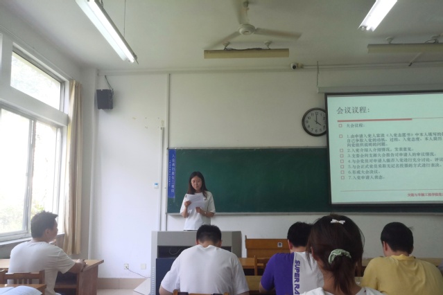 会议伊始,孙艾宁同志介绍了本次会议的流程,会议按照流程依次进行。首先,由党员发展对象宣读《入党志愿书》中本人填写的部分,汇报自己争取入党的动机、过程、入党态度、本人简历,以及需要向党组织说明的问题;随后,入党介绍人如实介绍了发展对象基本情况,并对其能否入党表明态度,高萌同志代表支委会向支部大会报告对申请人的审议情况;接着,与会党员对申请人能否入党发表意见,并采取无记名投票的方式进行表决,与会成员一致同意接收孙天齐等26名同志为中共预备党员,随后党员发展对象逐个对表决结果表态,纷纷表示一定不会辜负老师的期望,在将来不断改正自己的缺点,争取早日成为一名正式党员。