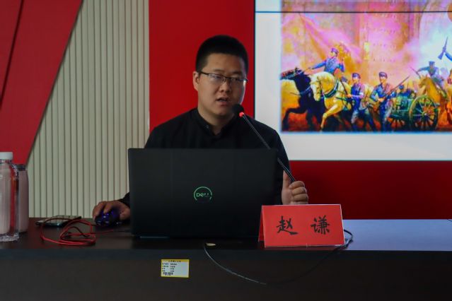 赵谦向学员们讲述了五四运动的兴起,讲到西方与东方社会背景上的差异,并提到日本明治维新的实行是日本迅速强大的原因,中国由此向日本展开了学习;第一次世界大战期间,由于巴黎和会对中国的不公,深深伤害了国人的民族情感,使国人从心底否定了对西方的向往,再一次踏上了寻找中国前程的道路;讲解中国共产党成立的原因,马克思主义在中国的传播提供了思想基础,工人运动的开展提供了群众基础,早期党组织的成立提供了组织基础。再经世界形势和中国历史背景的推动,革命者们终于在1921年7月23日,在上海召开了中国共产党第一次全国代表大会。大会通过了《中国共产党党纲》,并且选举产生了党的领导机构,中国共产党从此成立了,真正踏上了新中国独立自强的征程.