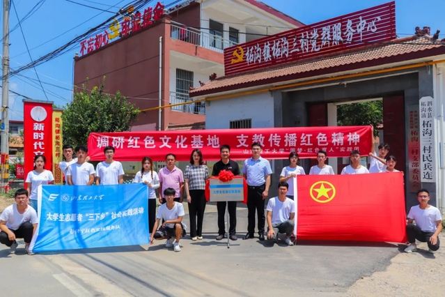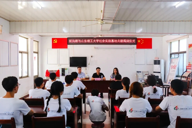 8月2日,山东理工大学与泗水县柘沟镇大学生社会实践基地共建揭牌仪式在泗水县柘沟镇柘沟三村党群服务中心举行。柘沟镇党委副书记侯东兵,柘沟镇党委委员、副镇长郭孟珏,柘沟三村党支部书记孙文田,学院辅导员张凯参加仪式并为社会实践基地揭牌。“圆梦·红色育人”社会实践团全体成员参加活动,实践团学生代表徐子雨主持仪式。
