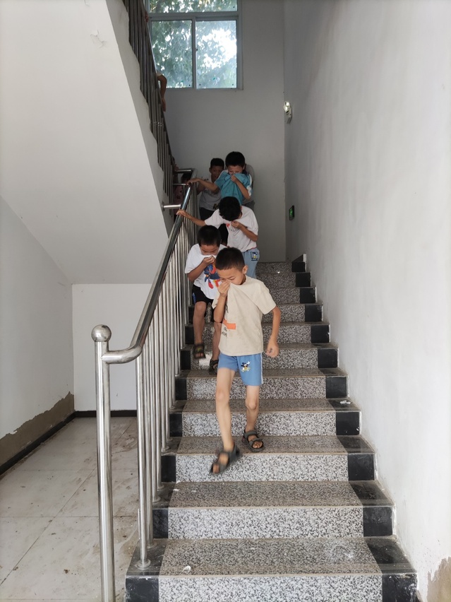 消防演练开始后,由实践团成员张鑫鑫在教室播放火灾警报声,并由实践团成员胡永琪组织带领学生快速有序下楼梯逃生,走到安全地带并报数。