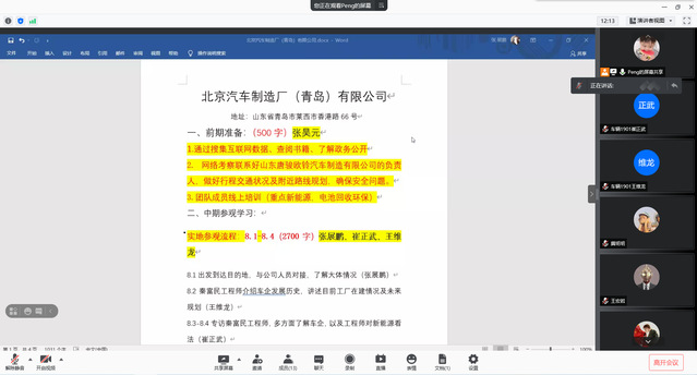 2021年8月8日,“开启新时代、转换新动能”调研实践团开展第二次线上会议,总结北京汽车制造厂参观学习工作。