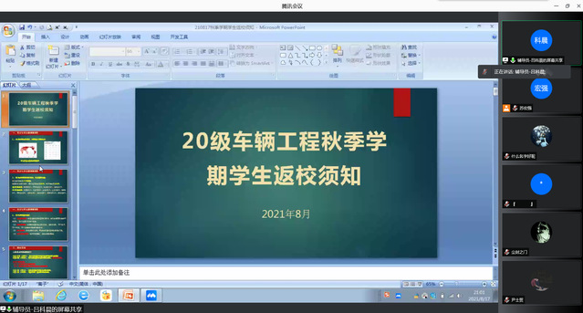 各位辅导员传达了学校关于返校工作的安排,从当前疫情的新特点及疫情防控形势、返校条件及返校要求、返校准备、注意事项等四个方面对返校安排作了详细说明。