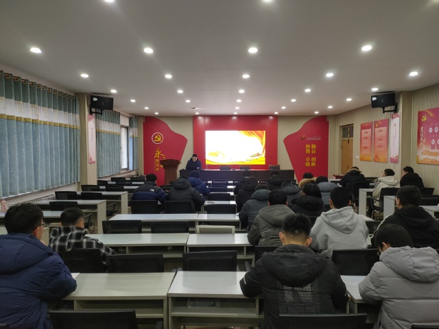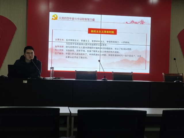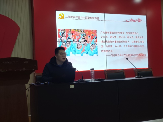 2022年1月13日,研究生第一党支部书记张凯在12教217教室为支部同志讲述《学习党的十九届六中全会精神—从党的百年奋斗中汲取智慧力量》专题党课。