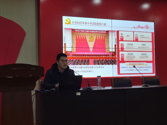 在专题党课上,张凯老师讲述了第十九届六中全会召开的时间、背景、内容、意义以及会议审议通过的两个重磅文件:《中共中央关于党的百年奋斗重大成就和历史经验决议》、《关于召开党的第二十次全国代表大会的决议》。