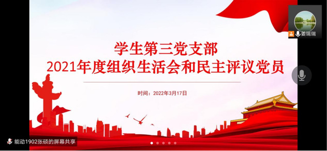 3月17日下午,我院学生第三党支部于腾讯会议线上召开2021年度组织生活会和民主评议党员工作,姜瑞瑞同志主持会议,支部全体党员参加,李本富同志出席会议。