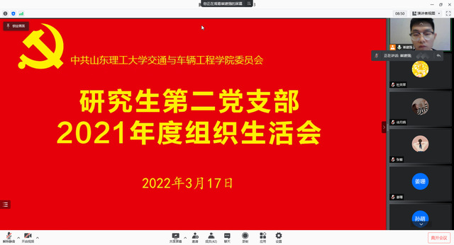 3月17日下午,研究生第二党支部通过线上会议的形式召开了2021年度党支部组织生活会,组织开展了民主评议党员工作。会议由党支部书记崔建强主持,学院党委委员、学院团委书记高萌出席会议并做指导,支部全体党员参加。