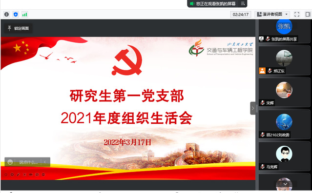 2022年3月17日下午,研究生第一党支部在线上召开2021年度组织生活会,开展民主评议党员工作。学院党委委员、副院长李波老师参加会议并指导点评,党支部全体党员参加会议。
