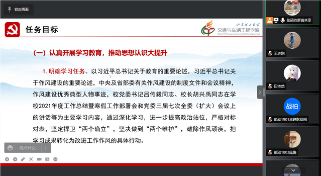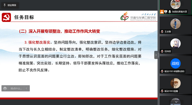 首先,姜瑞瑞同志介绍了本次集中理论学习的主题——学习《学校“作风建设年”专项行动实施方案》,《习近平总书记关于作风建设的重要论述》;面向党员部署《交通学院“作风建设年”专项行动工作方案》。