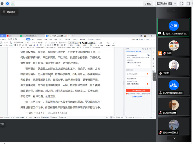 然后,庞龑同志围绕党的作风建设,介绍了习近平总书记的众多重要论述,提出了一系列新思想、新观点、新要求。通过强调作风建设的重要性,部署作风建设的推进,论述作风建设有何遵循等方面给党员干部提出了新的要求,党的干部,为人民服务是宗旨和信念,务实是职业操守和行动准则,清廉是思想底线、道德底线和法律底线要求,争当焦裕禄式好干部、好党员是我们不懈的追求,作风建设永远在路上。