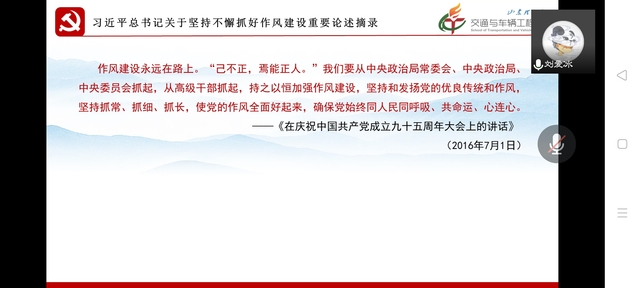 按照本学期党支部组织生活计划和“作风建设年”专项行动工作方案安排,2022年4月14日研究生第一党支部支部通过线上开展专题组织生活会,会议包括两个环节,第一环节是专题学习研讨关于加强作风建设的内容,第二环节是围绕作风建设开展座谈交流。