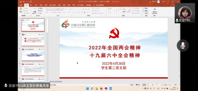 2022年4月28日下午,交通学院学生第二党支部采用线上腾讯会议和线下借用12号教学楼210教室相结合的形式召开党员发展对象公开答辩大会暨双周理论学习活动。此次会议由支部书记范晶晶主持,全体支部成员共同参加。