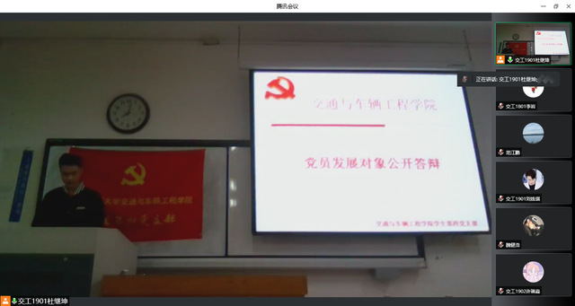 为深入贯彻落实党的十九大及十九届历次全会精神和习近平新时代中国特色社会主义思想,切实提升党员发展质量,结合支部党员发展工作需要,4月29日晚,我院学生第四党支部开展党员发展对象公开答辩暨第十周双周理论学习活动,考虑疫情防控的相关要求,支部书记周燕燕同志、正式党员及党员发展对象于12号教学楼参加会议,其他党员及部分入党积极分子通过腾讯会议参会。