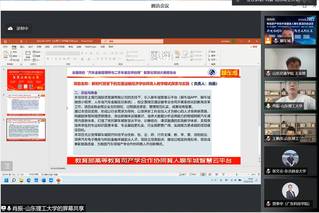 2022年6月18日,教育部产学合作协同育人聊车城项目启动会暨2022年全国高校汽车金融管理师与二手车鉴定评估师智慧云双创大赛开幕式举办。本届大会以“线上+线下”相结合的方式举办,线上通过腾讯会议室参会,并在重庆设立主会场。会议主题为“科技熔铸新金课·实践育人创未来”,会议共邀请来自全国各省市61名高校领导、教师及汽车产业学者、行业专家、名企高管参加。我院教师肖振、刘秉政、王鹏伟代表项目组成员参加了此次大会,共话育人未来,传递时代强音。