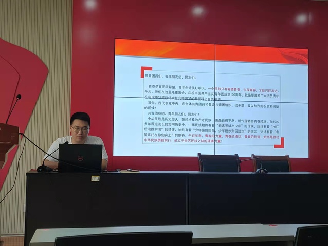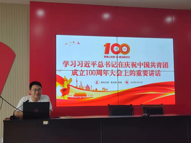 2022年6月23日,研究生第一党支部书记张凯在12教217教室为支部同志讲述《学习习近平总书记在庆祝中国共青团成立100周年大会上的重要讲话》专题党课。