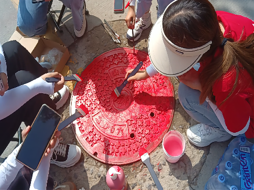 与此同时,实践团的另一部分成员,对买回的油漆进行稀释、混合,对此前已经勘察过的社区消防标识进行翻新,将掉漆的黄色警戒线,以及停车线进行重新刷漆。此外,为了让社区更加美观,实践团成员对主路干的井盖进行美化改造。